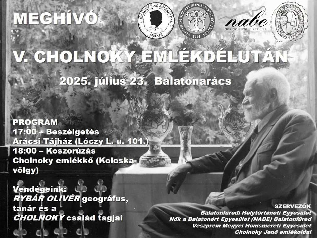 2025. júniusában tartottuk ötödik alkalommal a Cholnoky emléknapot Balatonarácson. A Balatonfüredi Helytörténeti Egyesülettel és a Nők a Balatonért Egyesülettel közösen szervezet eseményen Rybár Olivér vezetésével beszélgettünk a Cholnoky család munkásságáról, a hozzájuk fűződő emlékekről. Az emlékdélután zárásaként felkerestük és megkoszorúztuk a Koloska-völgyben kialakított kis emlékparkban található Cholnoky-emlékhelyet.