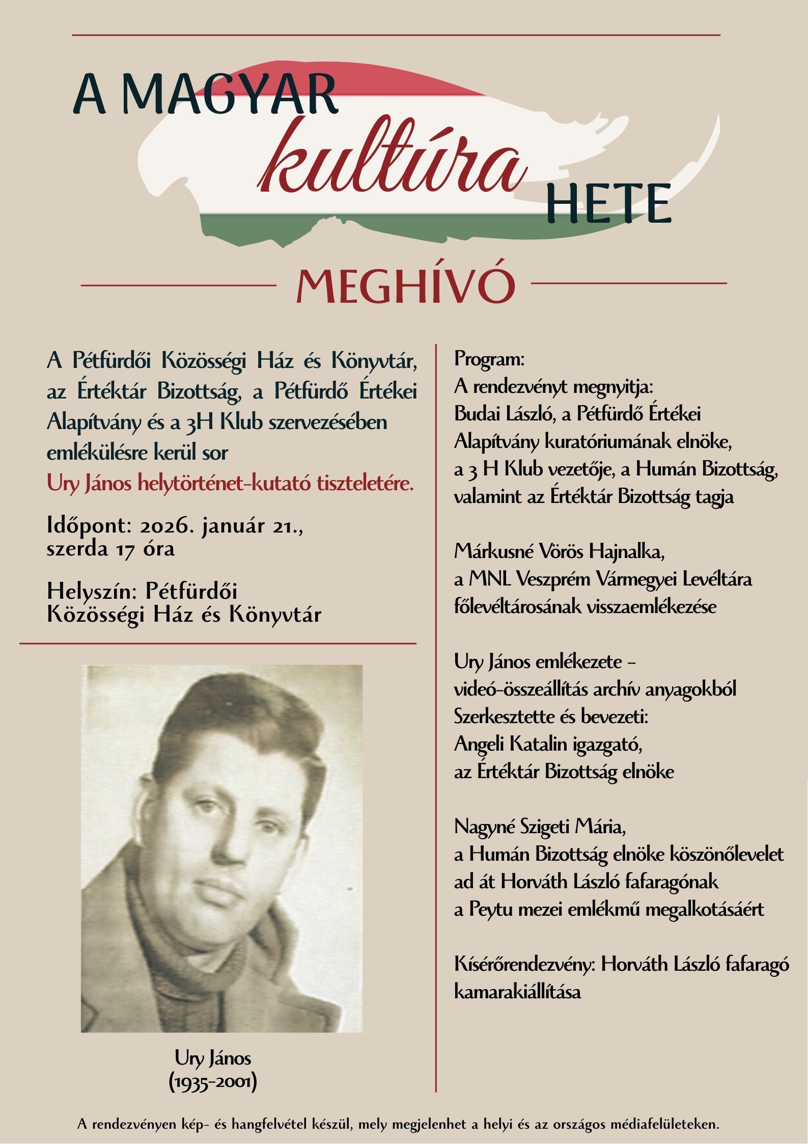 Magyar Kultúra Hete programsorozat keretein belül került megrendezésre az Ury János emlékülés január 21-én. A Pétfürdői Közösségi Ház és Könyvtár, az Értéktár Bizottság, a Pétfürdő Értékei Alapítvány, valamint a 3H Klub szervezésében került sor a megemlékezésre, a település egykori helytörténet-kutatójának tiszteletére. Az emlékülés összefoglalóját láthatják.