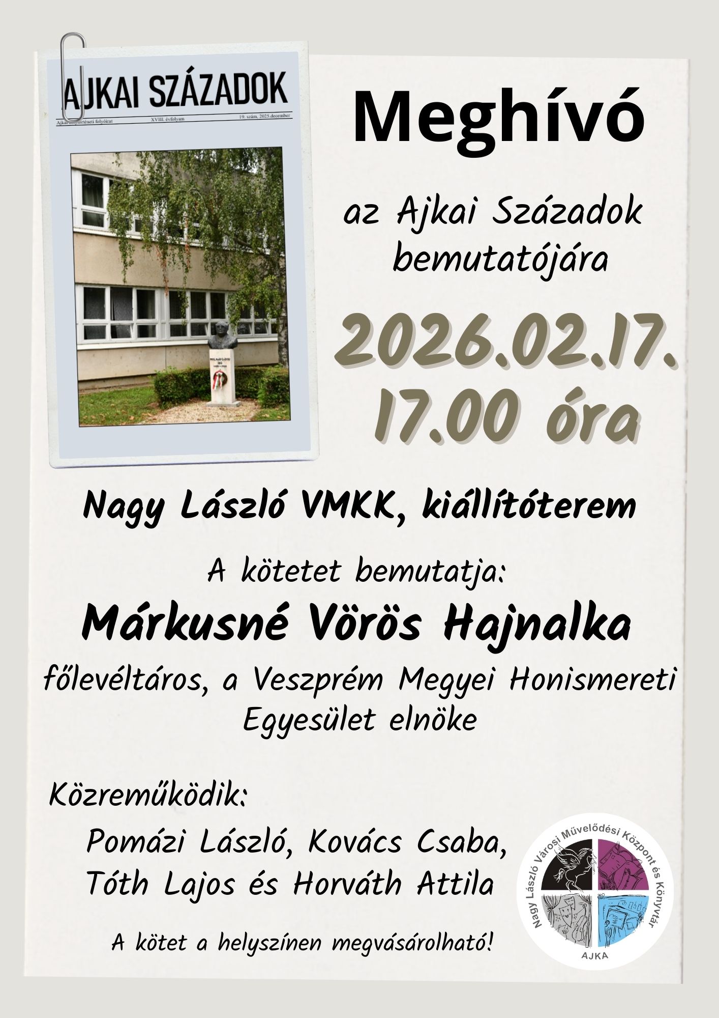 2026. február 17-re meghívást kaptunk az Ajka Századok helytörténeti folyóirat aktuális lapszámának ünnepélyes bemutatójára.