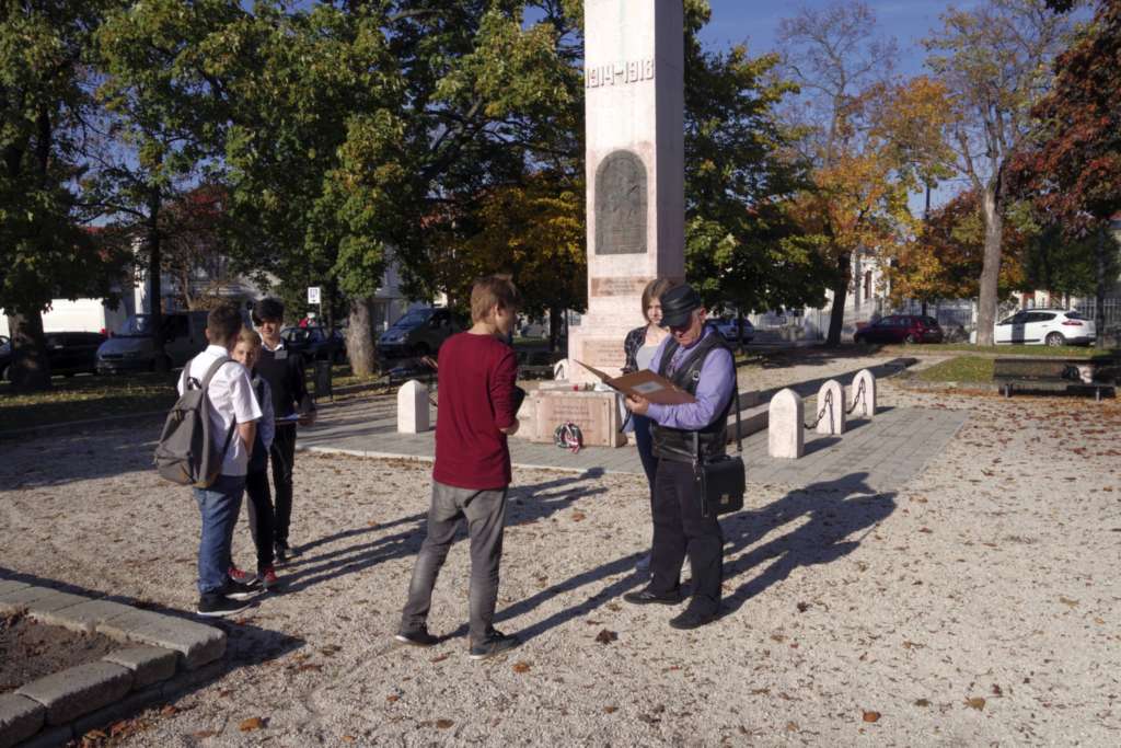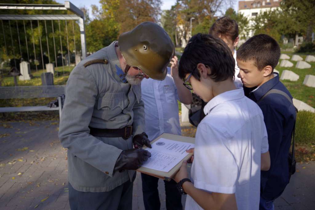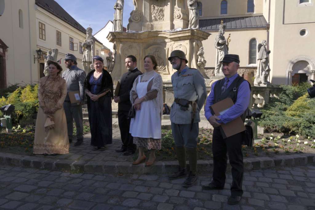 A Szentháromság téren 11 csapat gyülekezett, a felkészítés és az eligazítást követően Oláh Emil protestáns tábori lelkész megfontolandó gondolataival indultak útnak a Nagy Háború veszprémi epizódjaihoz köthető helyszínekre, ahol korhű jelmezes szereplők várták a diákokat.