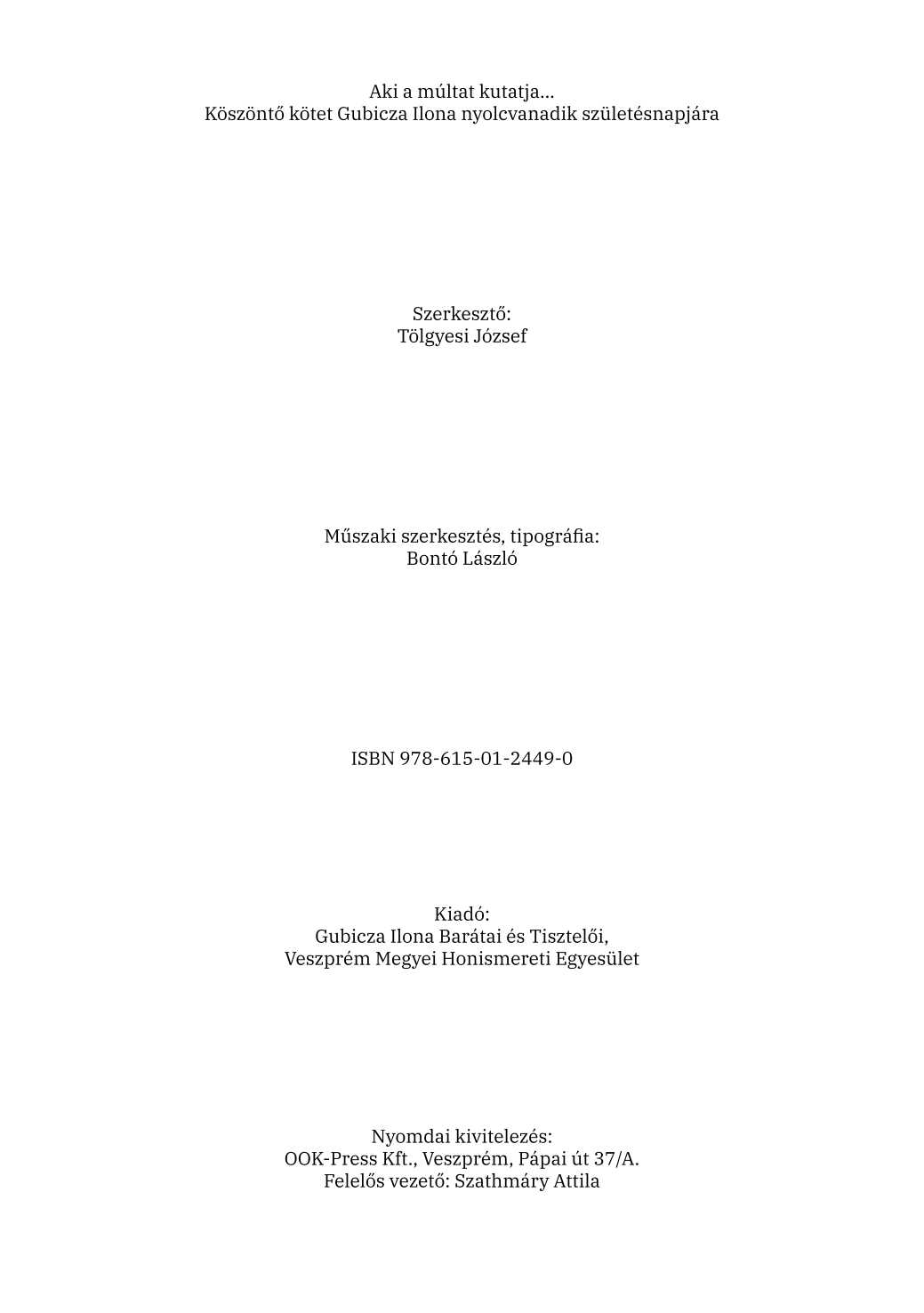 GUBICZA ILONA 80. születésnapja alkalmából rendezett baráti összejövetelen került bemutatásra 2021. szeptember 16. (csütörtök) 16 órakor, az Eötvös Károly Megyei Könyvtár Kisfaludy termében Gubicza Ilona Aki a múltat kutatja ... című kötete.