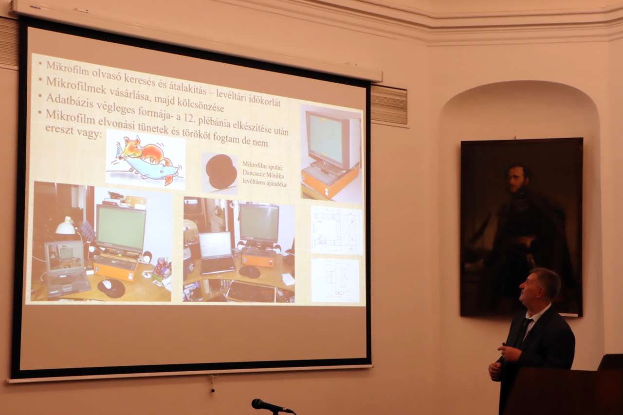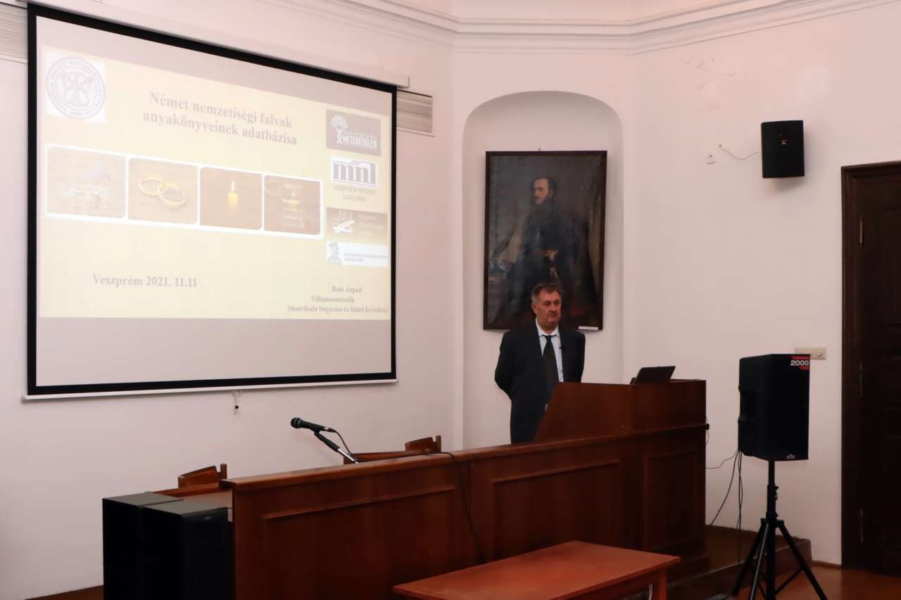 Baló Árpád, mérnök, kutató, a Német nemzetiségi falvak anyakönyveinek adatbázisai címmel tartott előadást. Baló Árpád, az adatbázis elkészítője előadása elején az adatbázis létrehozásának körülményeiről beszélt. 2003-ban kapott egy felkérést családtörténeti adatok gyűjtésére, családfa elkészítésére. Az adatgyűjtést plébániákon, levéltárakban végezte, nagyon sok dokumentumot digitalizált. A kutatásainak eredményeként egy családtörténeti albumot készített. A családfa elkészítése után tovább folytatta az adatok gyűjtését, és elhatározta, hogy a Veszprémi Főegyházmegye területén található települések anyakönyvi adatait egy adatbázisba rendezi. Az adatgyűjtés folyamán Excel-táblázatba írta be az adatokat, hogy könnyen kereshetők legyenek. Az anyakönyveket levéltárakban mikrofilmen kutatta, majd beszerzett egy mikrofilm olvasót, hogy még hatékonyabb lehessen a kutatás. A mikrofilmeket kikölcsönözte a levéltárból, így otthon, a saját mikrofilmolvasója segítségével tudta feldolgozni az adatokat. Az adatbázis szerkezetének, felépítésének kialakítása hosszú időt vett igénybe. Az adatbázisba a plébániai anyakönyvezés kezdetétől az állami anyakönyvezés bevezetéséig terjedő idősávból kerültek adatok. Az adatbázis csak a Veszprémi Főegyházmegye római katolikus keresztelési, házassági és halálozási anyakönyvek főbb adatait tartalmazza. A digitális képeket az adatokhoz hozzárendelhetővé tette.