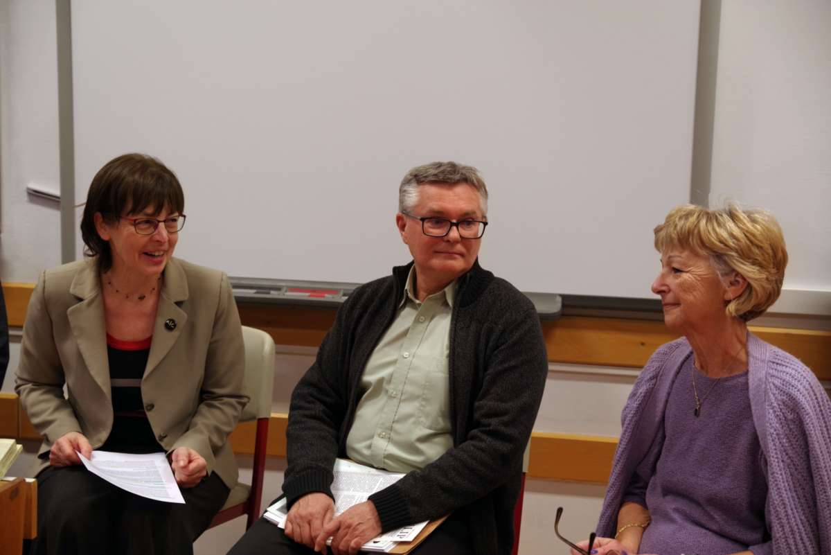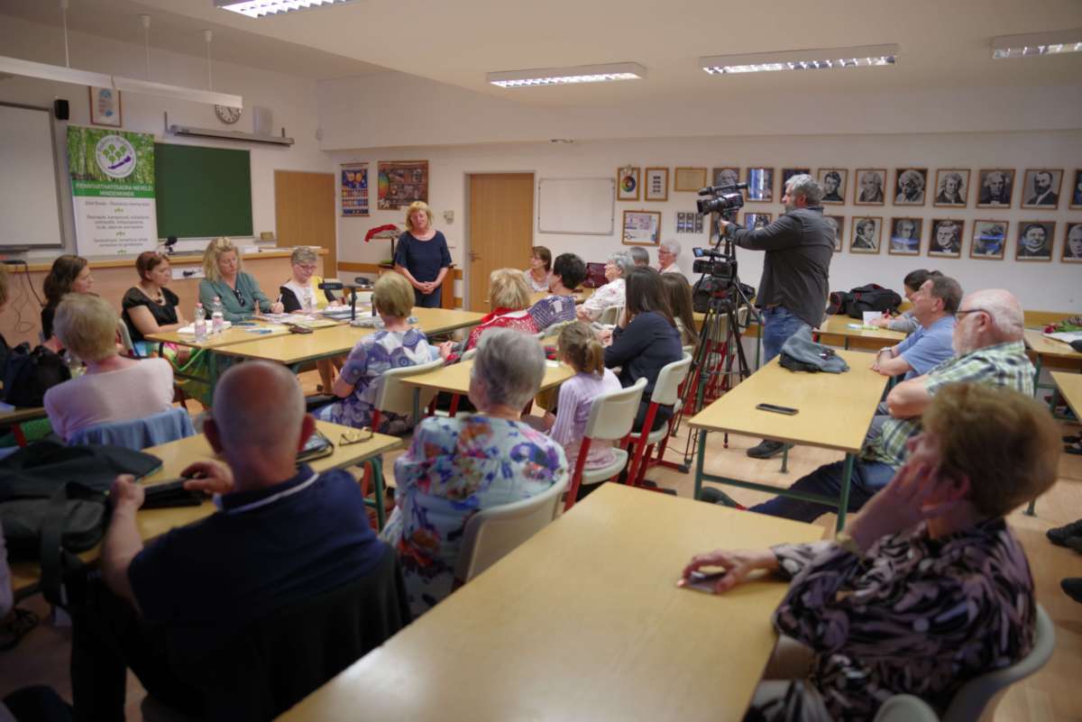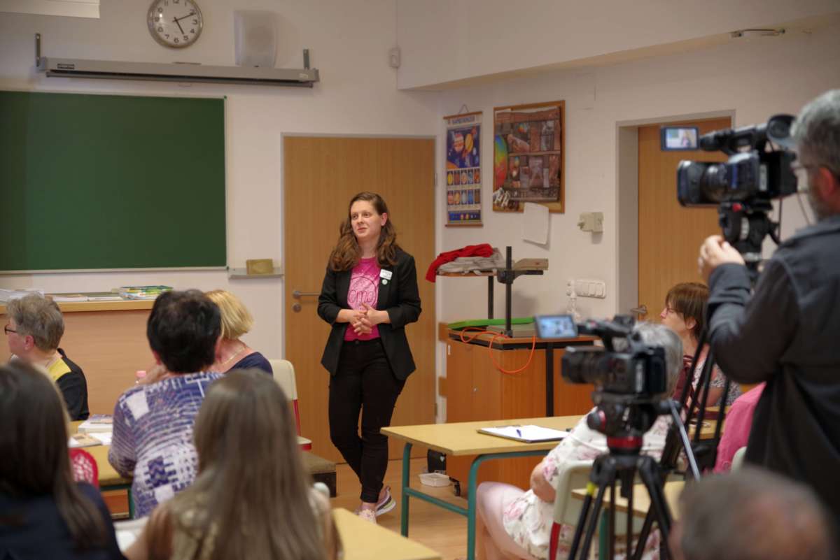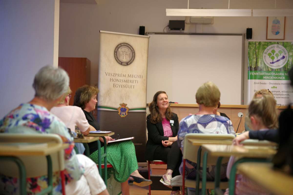 A beszélgetést vezető Zanathyné Lenkefi Éva tanár (a Cholnoky-iskola intézményvezető-helyettese)