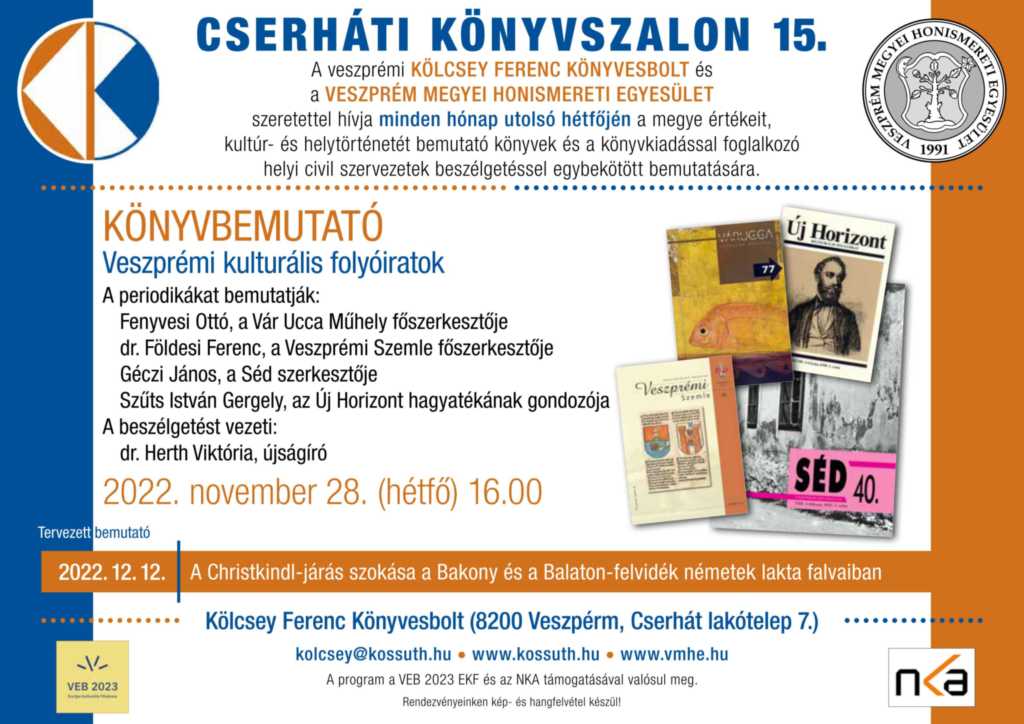 Sajtómegjelenés: NAPLO 2022.12.08. 6. oldal; VEOL online felületén: https://www.veol.hu/helyi-kozelet/2022/12/varosi-lapok-mutatkoztak-be-a-cserhati-konyvszalonban; Veszprémi7nap