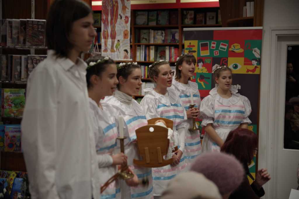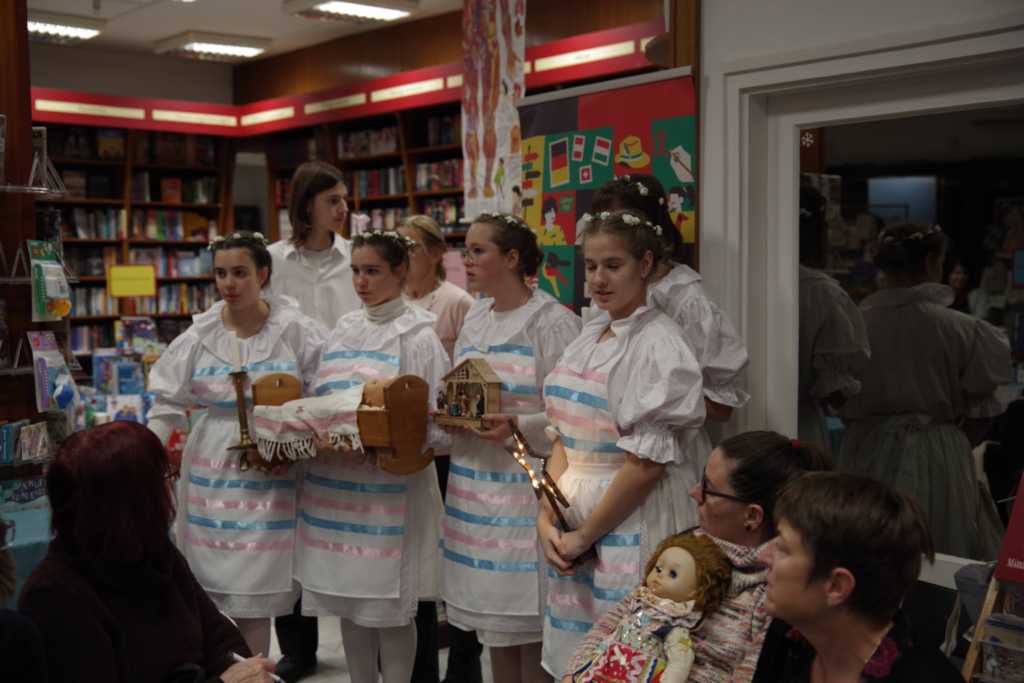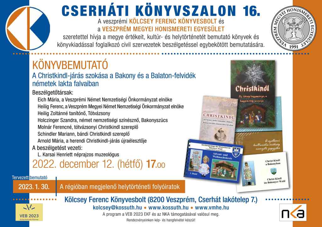 Karácsony előtt a Cserháti Könyvszalonban igazi Christkindl-köszöntést láthatott a közönség. A magyar ajkú lakosság körében ismert betlehemezéshez hasonló karácsonyi játékról van szó, melyet gyermekek adnak elő változó létszámú csoportokban. A német ajkú lakosság több hullámban történő betelepítése nemcsak a különféle iparosrétegek kiváló művelőinek érkezését jelentette; megjelent velük takarékos, munkaszerető, összetartó életstílusuk megannyi jellemzője, a nyelv, a gasztronómiai sajátosságok mellett a magyar vidék életébe beépültek a kedves német hagyományok is. Utóbbiakra, így a karácsony előtti Christkindl-járásra már az a jellemző, hogy a hajdani, küldő német területeken már nyomokban sem fellelhető. A német gyakorlattal szemben a hazai németség viseletében, énekeiben, szövegeiben településenként több-kevesebb eltéréssel, de őrzi a kedves hagyományt. Olyannyira, hogy a veszprémieknek köszönhetően 2020-ban a német nemzetiségi jegyzékbe is felkerült a Christkindl Spiel.
