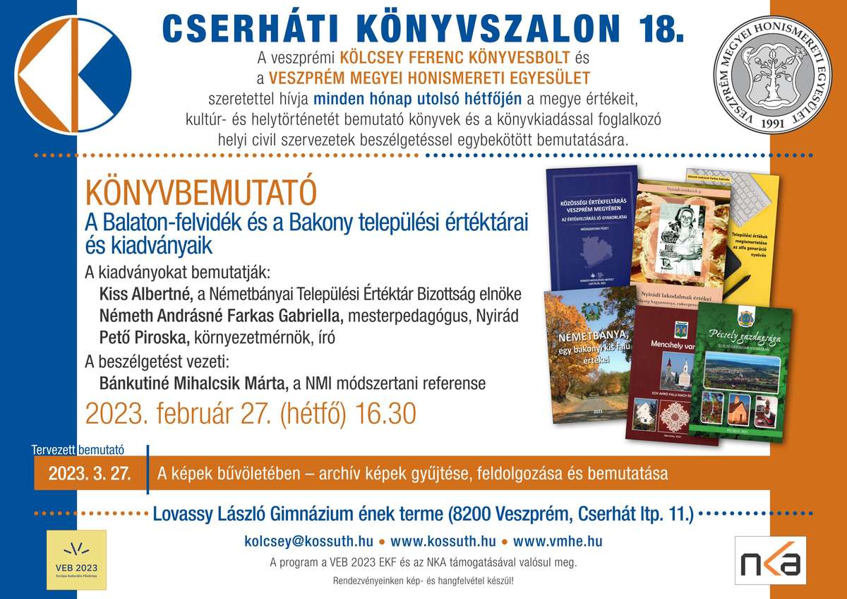 Sajtómegjelenés: NAPLO 2023.02.17. számának 6. oldalán; VEOL online felületén: https://www.veol.hu/helyi-kultura/2023/03/cserhati-konyvszalon-fokuszban-az-ertektari-munka; Veszprémi7nap 2023.01.26. 6. oldalán.