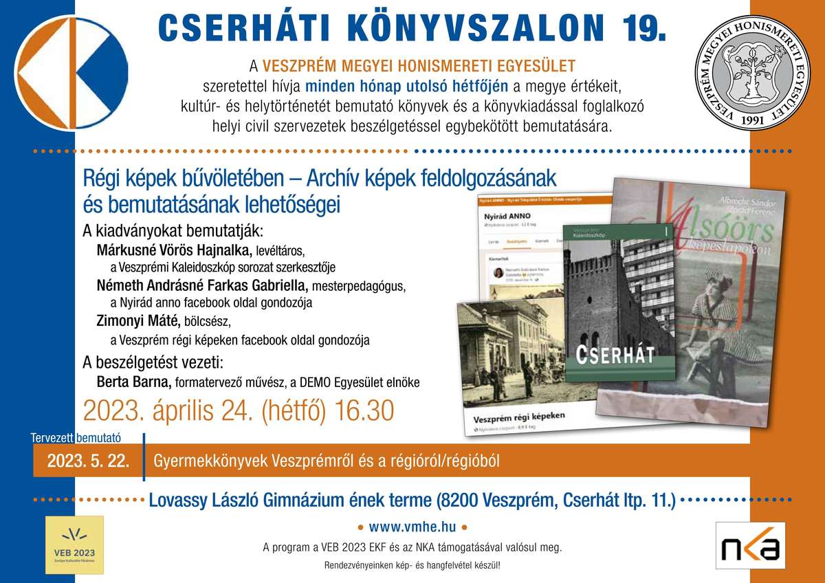 A Cserháti könyvszalon 19. előadása Régi képek bűvöletében – Archív képek feldolgozásának és bemutatásának lehetőségei címmel a Lovassy László Gimnáziumban, a régi fényképek, családi albumok és archívumok és képeslapok témáját járta körbe. A beszélgetés résztvevői a képek eredetét, témáit, megjelenési formáit és azok felhasználását a helytörténet írásban elemezték ki.