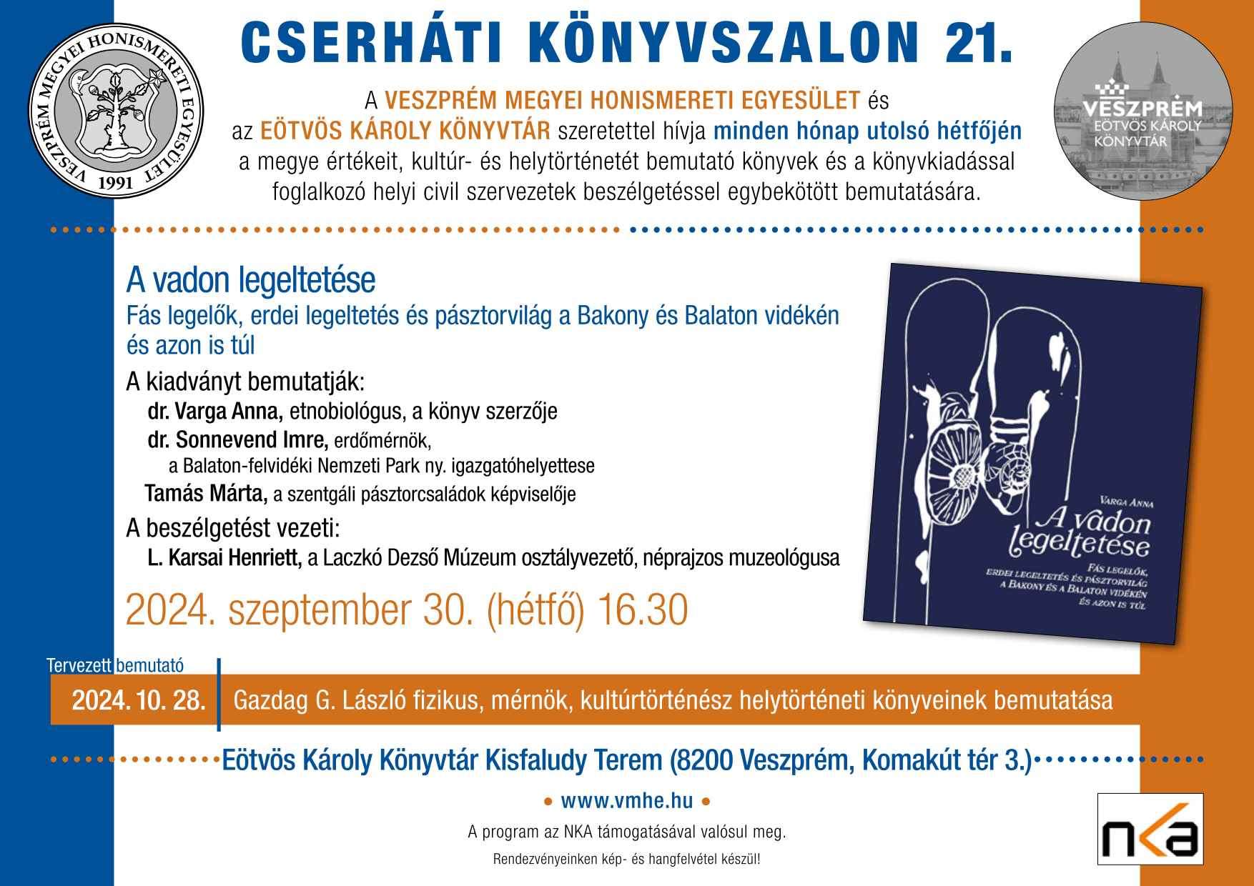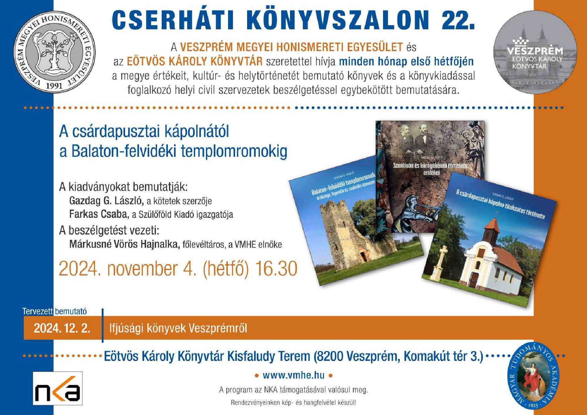 A Kölcsey Könyvesbolt és a Veszprém Megyei Honismereti Egyesület könyvbemutató sorozatának 13. alkalmán, amely 2022. szeptember 26-án (hétfőn) 16.30-kor kezdődött, két egyházi könyvtár és levéltár, a Veszprémi Érseki és Főkáptalani Könyvtár és Levéltár valamint a Pápai Református Gyűjtemények mutatkoztak be és hozták el értékes kiadványaikat.