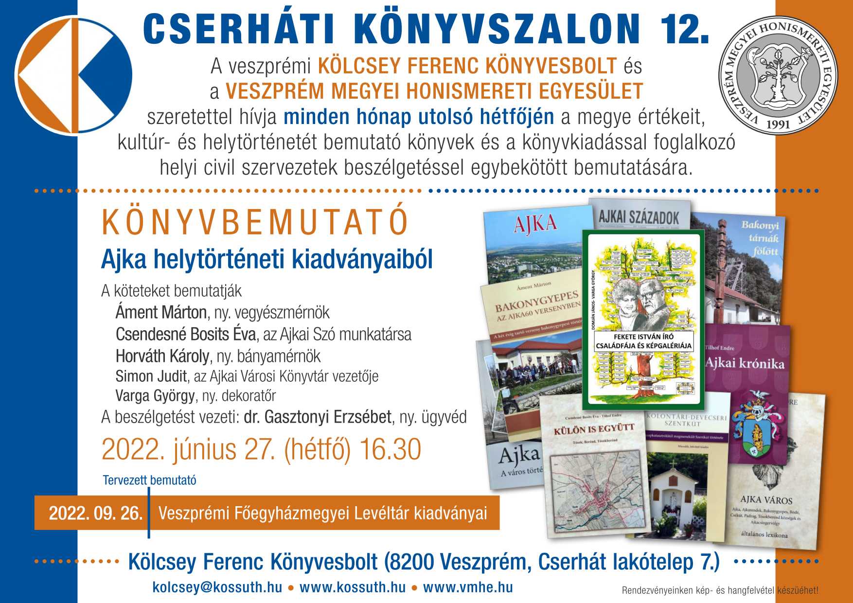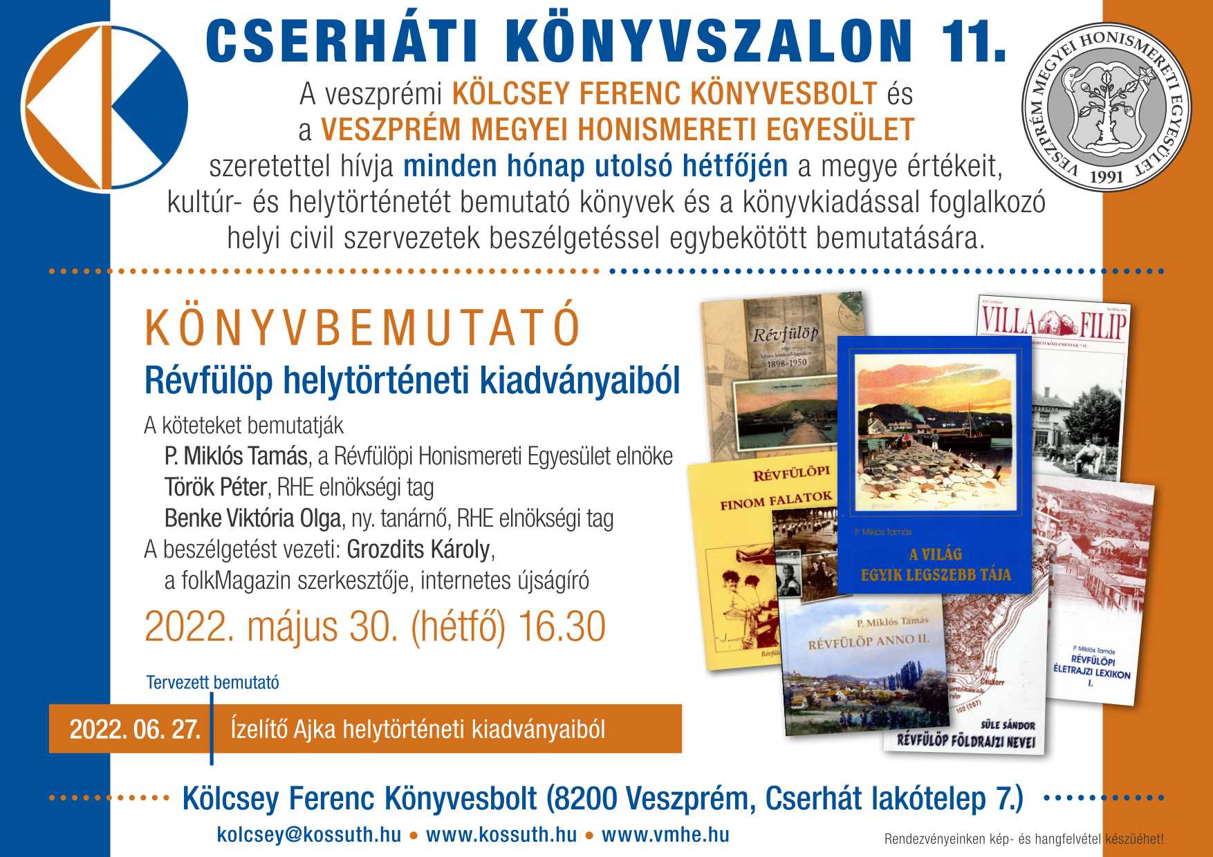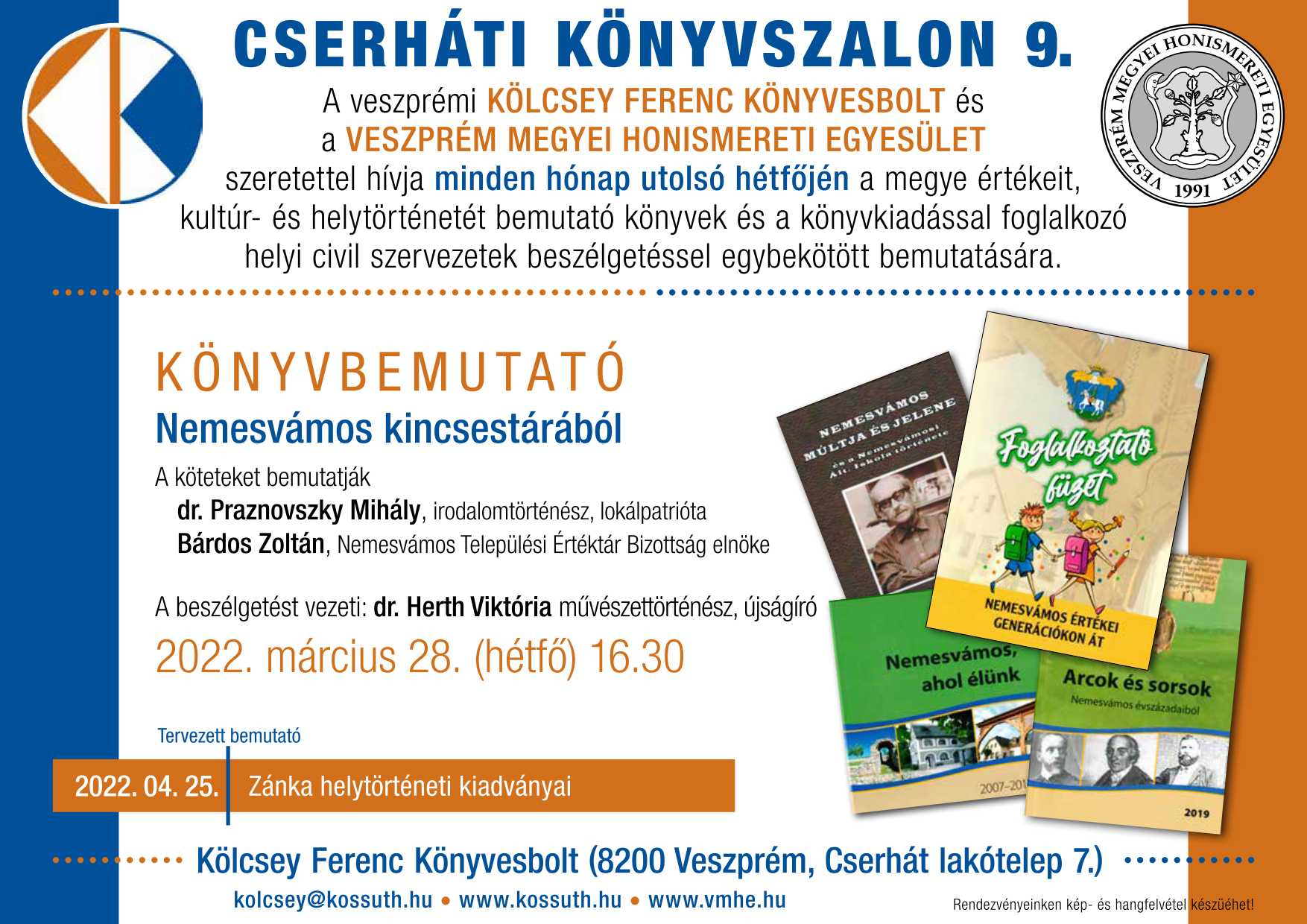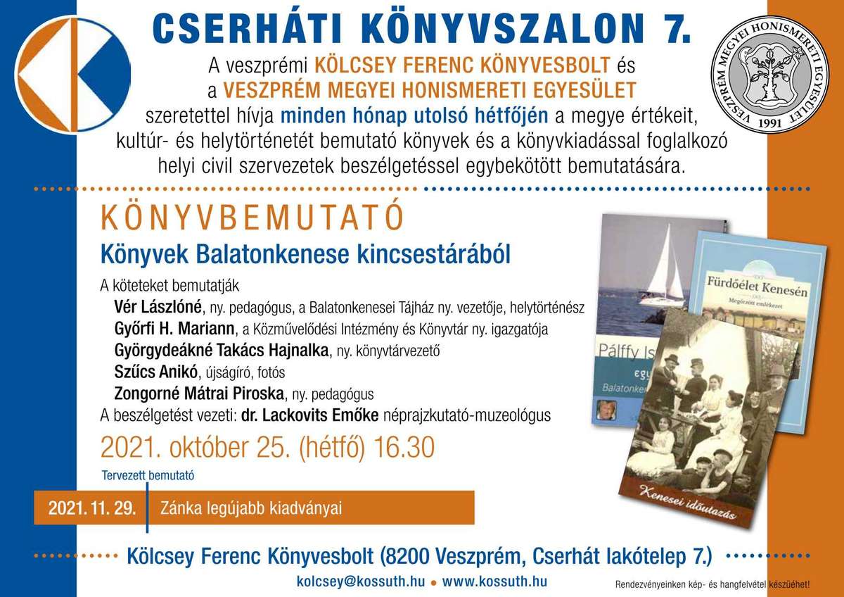 A veszprémi Kölcsey Ferenc Könyvesbolt és a Veszprém Megyei Honismereti Egyesület szeretettel hívja minden hónap utolsó hétfőjén a megye értékeit, kultúr- és helytörténetét bemutató könyvek és a könyvkiadással foglalkozó helyi civil szervezetek beszélgetéssel egybekötött bemutatására.