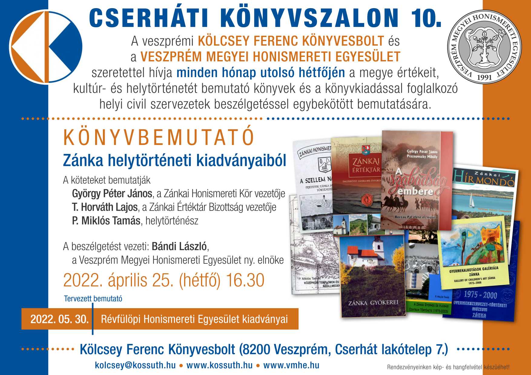 A Veszprémi Kölcsey Ferenc Könyvesbolt és a Veszprém Megyei Honismereti Egyesület szeretettel hívja minden hónap utolsó hétfőjén a megye értékeit, kultúr- és helytörténetét bemutató könyvek és a könyvkiadással foglalkozó helyi civil szervezetek beszélgetéssel egybekötött bemutatására.