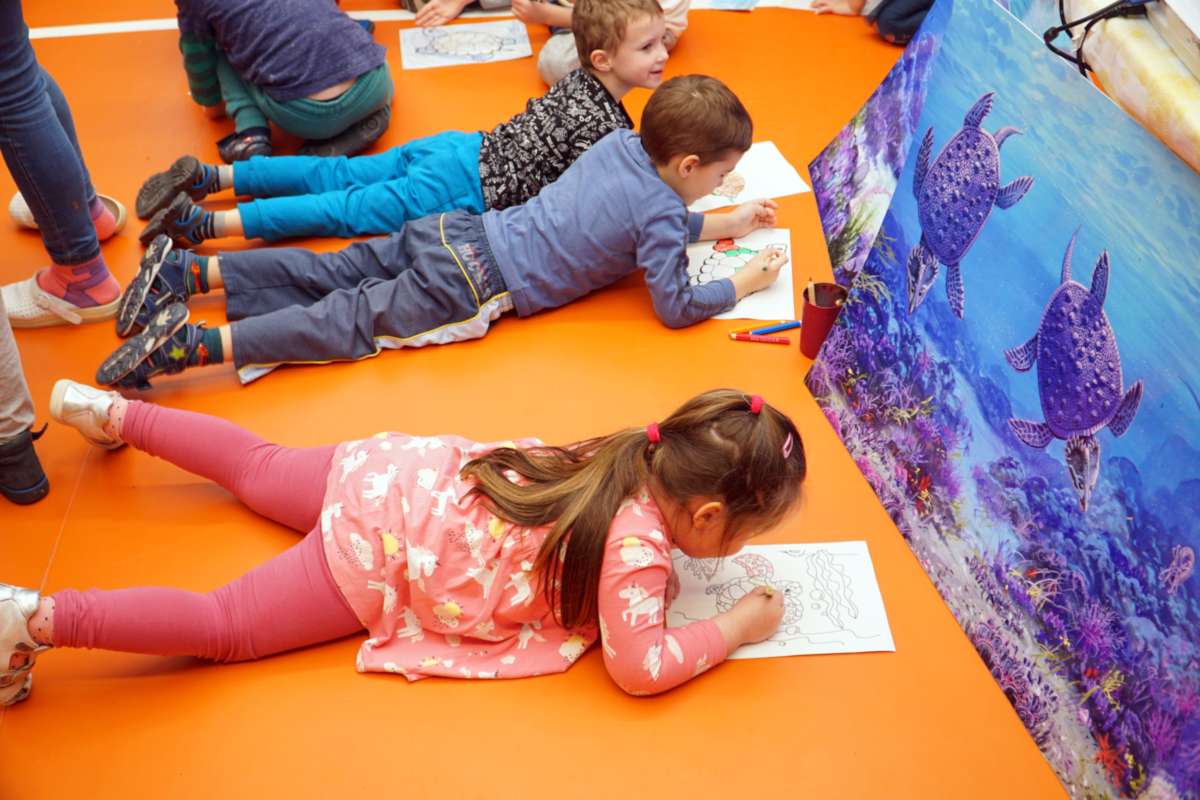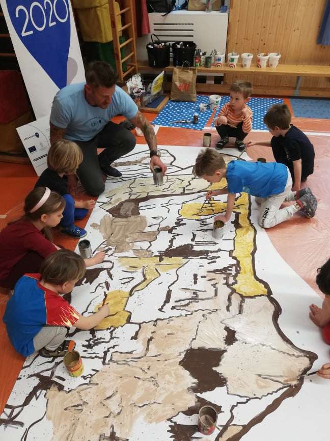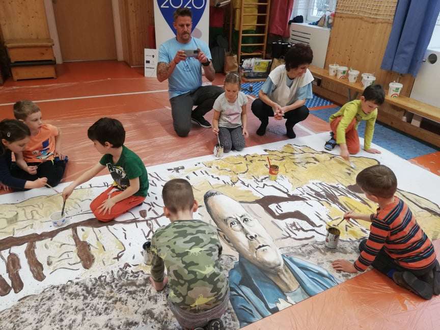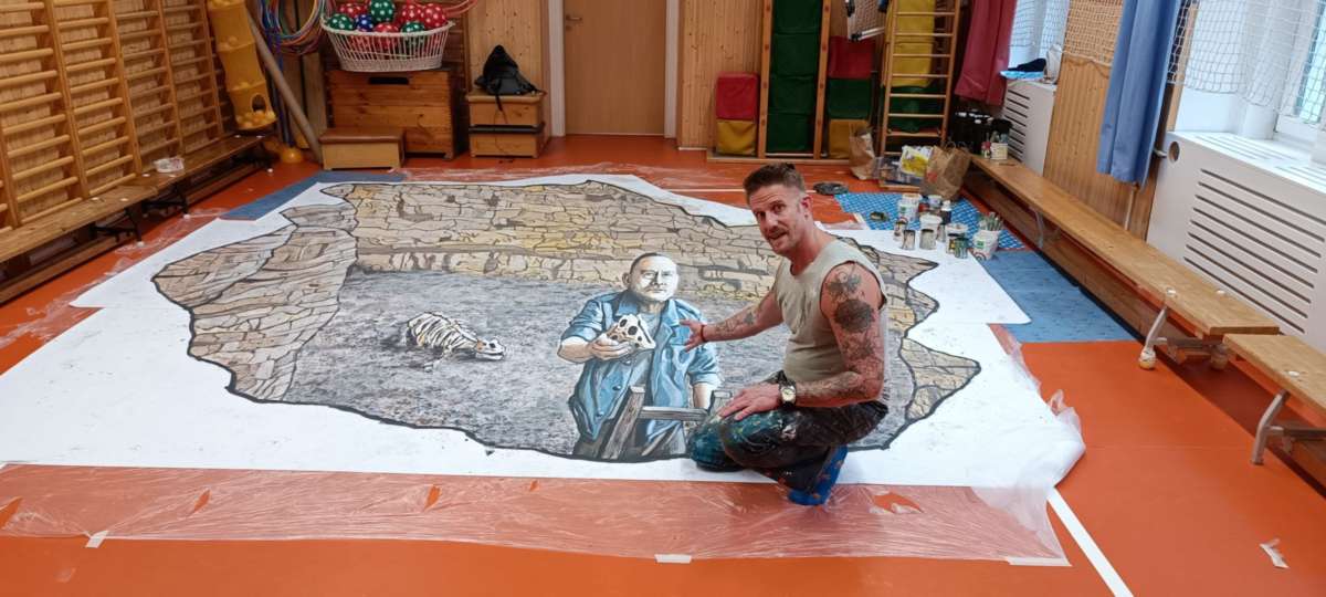 Gyulai Attila foglalkozása a gyerekekkel, amikor megalkották a Harmat utcában a "Placo téren" kihelyezemgő 3D hatású festményt:
