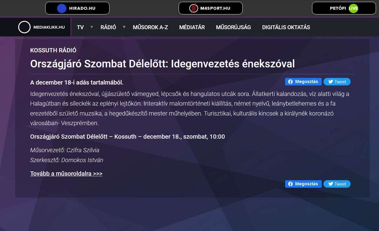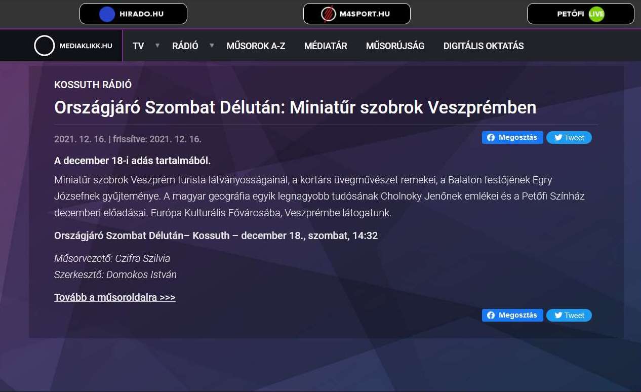 2021. december 18-án, a Kossuth Rádió Országjáró Szombat Délelőtt és -Délután információs magazin stábja Veszprémben járt.